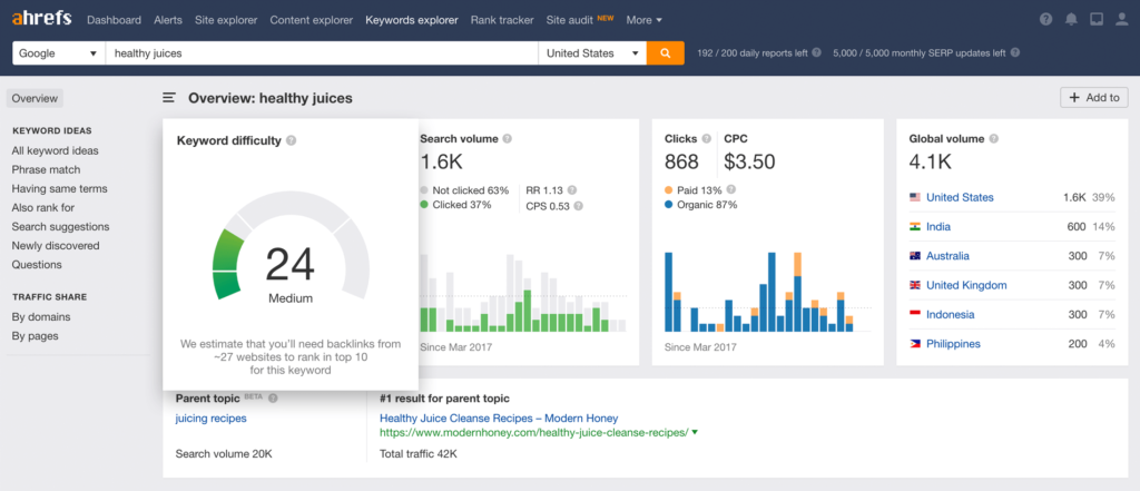One of the most popular keyword tools available is Ahrefs. They go into great detail, including the difficulty of the keywords, which I like. Ahrefs uses clickstream data to estimate your expected search engine clickthrough rate. To come up with ideas for Google, Bing, Amazon, YouTube, and a few more search engines, use the Keyword generator tool.