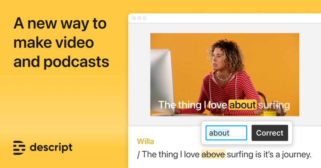 Descript is an AI-based video and audio editing software developed in 2017 that allows you to create and edit all kinds of videos, podcasts, etc. It is different than the traditional video/audio editing software. It is used to remove background noise, transcribe audio files, or generate voiceovers.